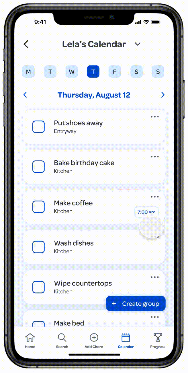 In earlier versions, chores could be grouped by dragging them together. This was difficult for people to figure out, so a “create group” button was added instead. After tapping the button, chores can be selected and added to a group.