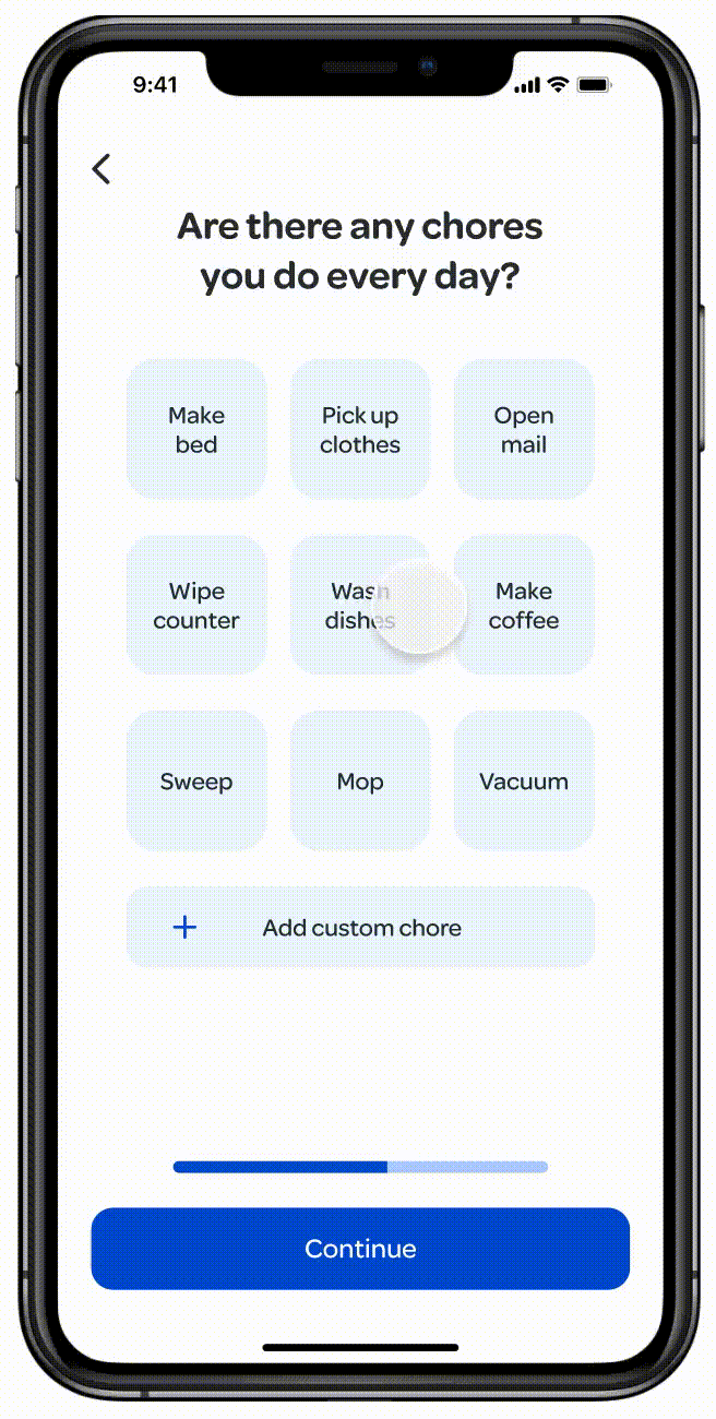 Initially, common daily chores were listed by rooms. To make the screen less cluttered and overwhelming, tasks were simplified to one small list where rooms can then be specified after tapping an item.